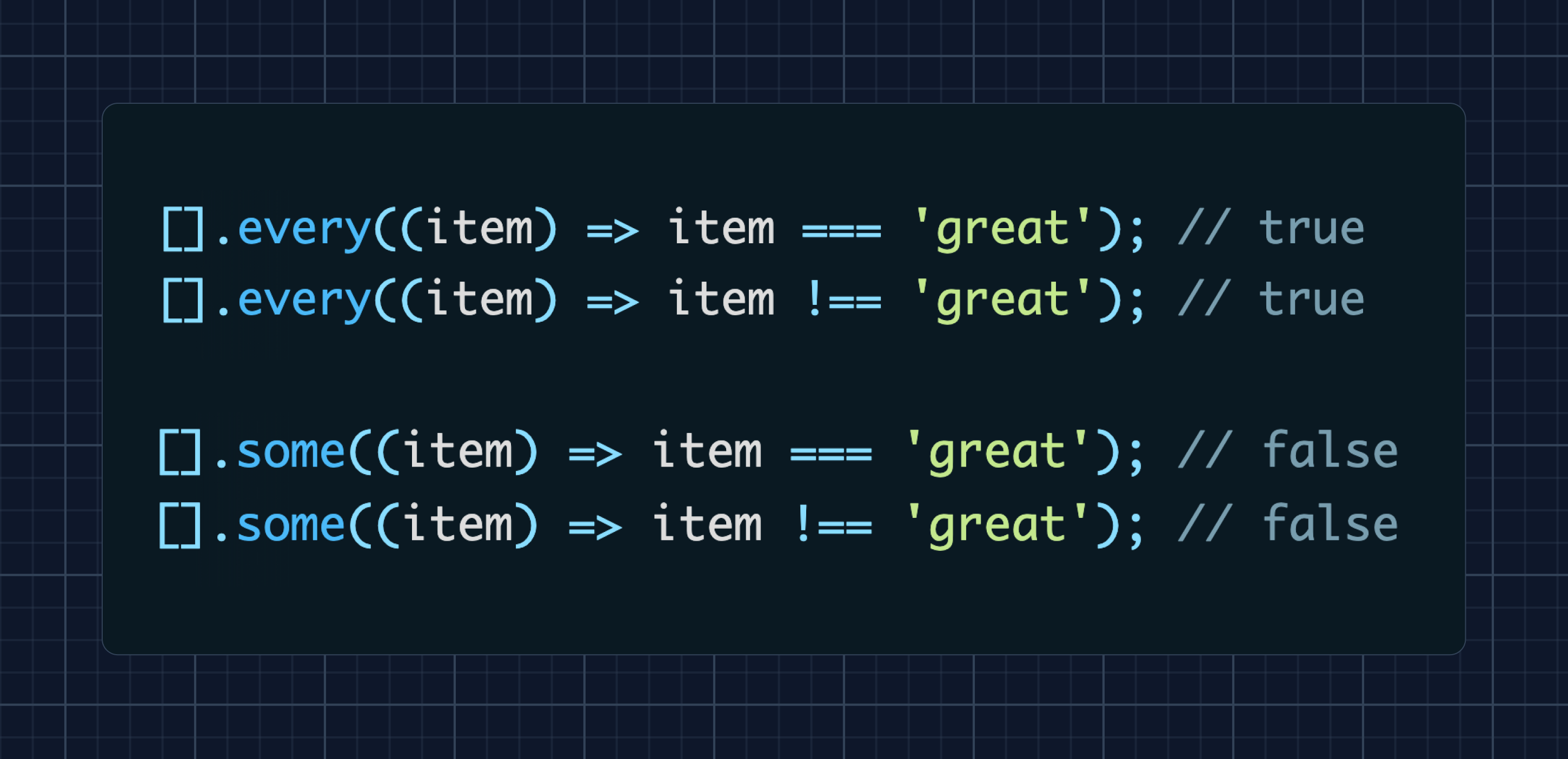 ![[].every((item) => item === 'great'); // true [].every((item) => item !== 'great'); // true [].some((item) => item === 'great'); // false [].some((item) => item !== 'great'); // false](https://images.ctfassets.net/f20lfrunubsq/2zrNOvndBMmRpGf5yfj2Wh/56f4d0492e8d7fc730d739d1382633d5/Group_710.png)