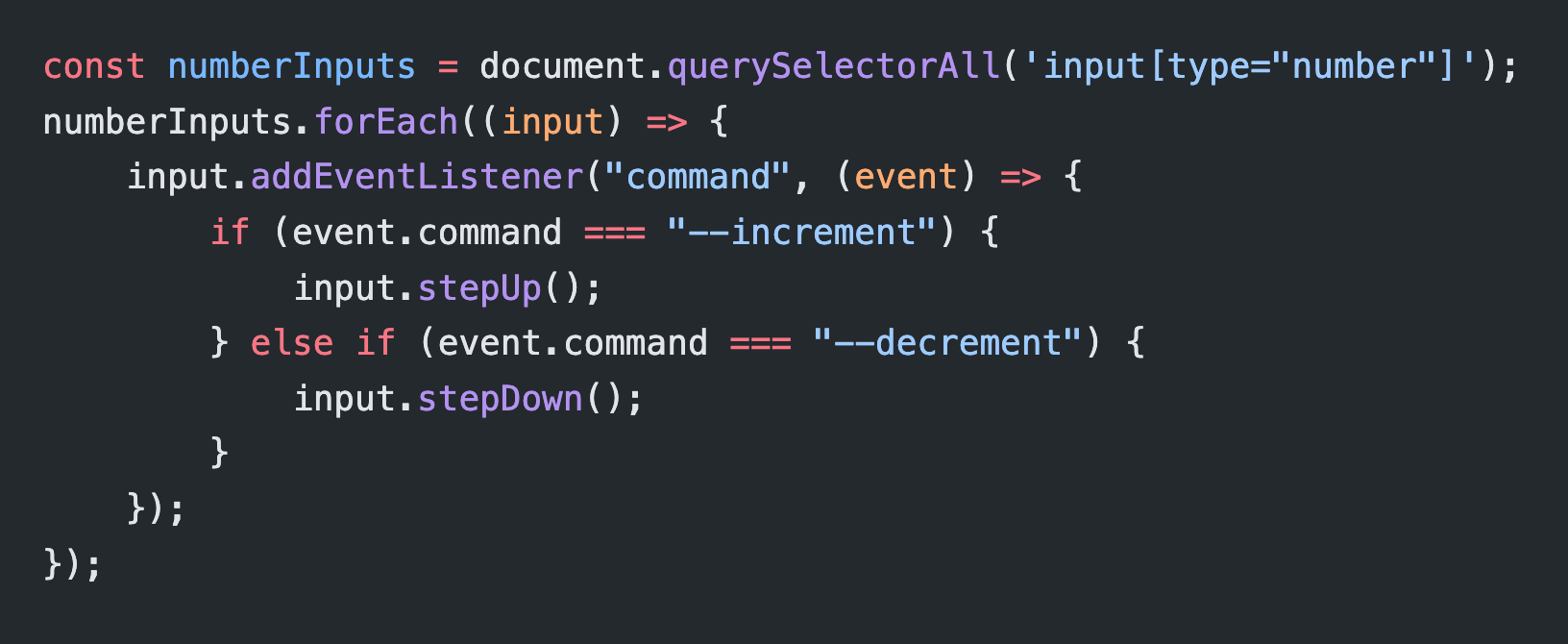 ![const numberInputs = document.querySelectorAll('input[type="number"]'); numberInputs.forEach((input) => { input.addEventListener("command", (event) => { if (event.command === "--increment") { input.stepUp(); }}); });](https://images.ctfassets.net/f20lfrunubsq/6hdKzNdqSl3blmc4lOdXOl/1eb8a31b7a0208ccb828cc74d5b469e1/Screenshot_2025-11-17_at_14.32.04.png)