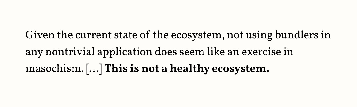 Lea reflects on the current state of web dependencies, and frankly, it's not great. Could we improve the current state to work without heavy bundler dependencies? I hope so!